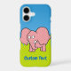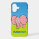 Cute pink baby elephant cartoon on green grass, under blue sky. Custom text.