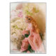 A photographic fine art card of a pink fairy figurine. She is surrounded by flowers with a soft background edged in white as in a vignette.