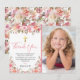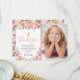 Elegant first holy communion thank you cards featuring a simple white background that can be changed to any colour, a photo of your child, pretty pink watercolor flowers, a gold religious cross, and a modern thank you template that is easy to personalise.