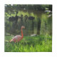 A beautiful setting in a park. A pond with flamingos and a pink flamingo in the foreground.