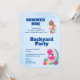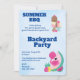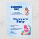A backyard party BBQ invitation. A cute flamingo illustration with watermelons and pineapple. .Ice cream treats illustrate this summery invitation. Light blue background.