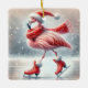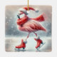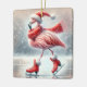 A whimsical flamingo glides gracefully across an icy surface wearing ice skates, a warm scarf, and a Santa Claus hat.