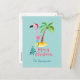 A festive postcard with a cute illustration of a pink flamingo in a red santa hat. Standing beside a green palm tree on a mound of yellow sand. A fancy swirly christmas tree design is placed beside the text Merry Christmas. Written in the colour pink in a fancy handwritten font. Pastel green background.. The front has space to include your personalised name. The back has your personalised return address and a Christmas message. All text can be changed / customised to suit your needs.