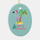 A christmas ornament with a tropical island flair. A cute illustration of a pink flamingo in a red santa hat. Standing beside a green palm tree on a mound of yellow sand. A fancy swirly christmas tree design is placed beside the text Merry Christmas. Written in the colour pink in a fancy handwritten font. Pastel green background.