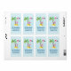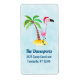 Large christmas shipping labels with a whimsical drawing of a pink flamingo wearing a red santa hat. Standing on a mound of yellow beach sand with a green and brown coconut palm tree in the back. Light blue background with a faint polygonal pattern. Cute and fun festive tropical design.