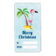 A gift label with space to write in the from and to names. A whimsical drawing of a pink flamingo wearing a red santa hat. Standing on a mound of yellow beach sand with a green and brown coconut palm tree in the back. Light blue background with a faint polygonal pattern. Cute and fun festive tropical design.