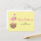 Christmas postcard with a tropical themed Christmas flamingo wearing a pink santa hat. Underneath its feet is a candy cane bouquet with pretty tropical flowers and pink berries. A sprig of holly on its chest.