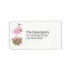 Address labels with a tropical themed Christmas flamingo wearing a pink santa hat. Underneath its feet is a candy cane bouquet with pretty tropical flowers and pink berries. A sprig of holly on its chest.