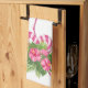 A kitchen towel with a tropical themed Christmas flamingo wearing a pink santa hat. Underneath its feet is a candy cane bouquet with pretty tropical flowers and pink berries. A sprig of holly on its chest.