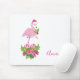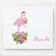 A mousepad with a tropical themed Christmas flamingo wearing a pink santa hat. Underneath its feet is a candy cane bouquet with pretty tropical flowers and pink berries. A sprig of holly on its chest.
