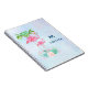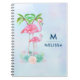Spiral Notebook with an illustration of a momma and baby pink flamingo standing on a bed of floral succulent flowers with green palm trees swaying in the back. Tropical and pretty. The background is a summery light blue watercolor with hints of purple. Personalised with your name and initial separated by a thin blue line.