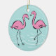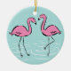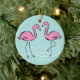 This ornament features a couple of pink flamingos wading in water. Back of ornament has names along with a monogram for you to personalise. Blue background colour may be changed by customising.