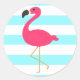 Pink Flamingo on Light Teal Stripes Classic Round Sticker