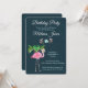 A whimsical birthday party invite with an illustration of a pink flamingo with green palm trees behind and a decorative floral succulent bouquet. Tropical and pretty. The