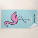 This beach towel features a pink flamingo wading in water with a name below for you to personalise. Blue background colour may be changed by customising.