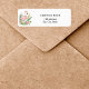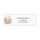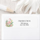 A white background, decorated with a pink flamingo and tropical flowers and foliage. Personalise and add your name and address. Black letters.