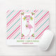 A whimsical tropical christmas mouse pad personalised with a name and the text Merry Christmas. A fancy pink flamingo with a leg raised up. Wearing a pink santa hat and some seasonal holly. Holly with berries also decorate the corners. A floral bouquet with candy canes above her head. A pink and green candy cane striped background.