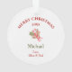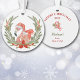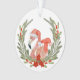 This is an adorable Christmas ornament for parents or grandparents to give to a child, but it can be easily customised as a gift for anyone. The front of the ornament has a watercolor image of a pink flamingo bird wearing a Santa hat and scarf. The flamingo is sitting within a pine needle, holly, and red berry wreath. The back of the ornament has your custom text in red and green. The text fields are separated by a small candy cane and holly bouquet. Easily change the text to anything you'd like!