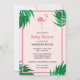 Pink and green tropical pink flamingo theme baby shower invitation printed with your party details in coordinating dark grey block font. Customise this invitation with the name of the mum-to-be, the date and time of party, address, registry and rsvp information. Additional lines of text can be added using the customise it feature.