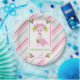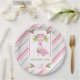 Whimsical tropical christmas paper plates. A fancy pink flamingo with a leg raised up. Wearing a pink santa hat and some seasonal holly. Holly with berries also decorate the corners. A floral bouquet with candy canes above her head. A pink and green candy cane striped background.