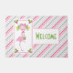 A whimsical tropical christmas welcome doormat. A fancy pink flamingo with a leg raised up. Wearing a pink santa hat and some seasonal holly. Holly with berries also decorate the corners. A floral bouquet with candy canes above her head. A pink and green candy cane striped background.