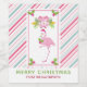A whimsical tropical christmas bottle label. A fancy pink flamingo with a leg raised up. Wearing a pink santa hat and some seasonal holly. Holly with berries also decorate the corners. A floral bouquet with candy canes above her head. A pink and green candy cane striped background.