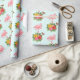 Wrapping paper with a cute digital illustration featuring a pink flamingo with one leg raised. Standing on a bouquet of tropical hibiscus flowers and leaves. A pretty butterfly is hovering around the flowers.