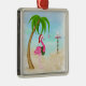 Holiday ornament with tropical holiday theme. Design features pink flamingo with Santa hat and wreath, palm tree and North Pole sign on beach background. A perfect gift for those celebrating the holidays in warm climates.Graphics©http://www.delightful-doodles.com/