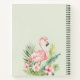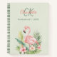 A trendy sage green background decorated with a pink flamingo and tropical flowers and foliage. Personalise and add a name and your monogram initials.