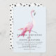 Unique tropical style wedding invitations featuring a pink flamingo in a painted style on the front. On the reverse side is a dotted black and white abstract pattern.