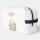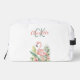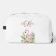 A stylish white background decorated with a pink flamingo and tropical flowers and foliage. Personalise and add a name and your monogram initials.