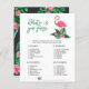 Baby shower invitation design features pink flamingo with lush green palm leaf fronds and tropical hibiscus flowers. "Aloha Baby". A tropical floral pattern with black background colour dresses up the back of the card.