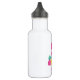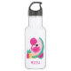 Personalised water bottle with a cute illustration of a pink flamingo with some watermelons and pineapples. Pink and green colour scheme. Summery and tropical.