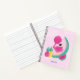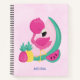 A personalised spiral notebook with a cute illustration of a pink flamingo with some watermelons and pineapples. Pink and green colour scheme. Summery and tropical. Light pink background.