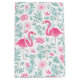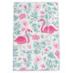 Cute pink flamingos and tropical flowers illustrations in a seamless pattern over the white changeable background colour.