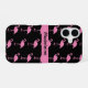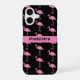 Bright pink cartoon flamingos stand against a black background, creating a phone case that is cute and fun! Easy to personalize with your name or monogram in a matching pink band.