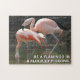 11” x 14” jigsaw puzzle with an image of two pink flamingos and an optional inspiring message that reads, "Be a flamingo in a flock of pigeons."