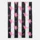 A pink flamingo pattern is on a black and white striped kitchen towel.