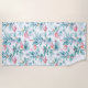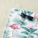 Tropical leaves and flowers with pink flamingos in a seamless pattern on a white background.