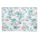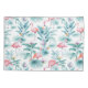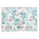 Tropical leaves and flowers with pink flamingos in a seamless pattern on a white background.