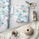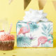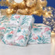 Tropical leaves and flowers with pink flamingos in a seamless pattern on a white background.