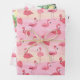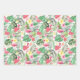 Three sheet wrapping paper set with pink flamingos on a variety of backgrounds from pink and yellow watercolor to tropical leaves.