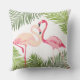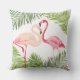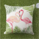 Tropical style pillow design features two pink flamingos in love framed by lush green palm leaves.