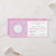 Long main invitation in pink for the Floral Around the Clock Shower Suite. A silver clock face is the focal point of the design. Floral silhouettes surround it, adding a soft, bridal motif. More clocks decorate the back. Choose from three different background colours: teal, pink, or purple. With the bold clock and bright colours, no one will mistake the theme of the shower!