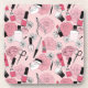 This design features a pattern including various beauty supplies on a pink polka dot pattern.