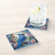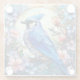 On this glass coaster, a beautiful blue jay perches within a light sky circle. The circle and bird are surrounded and overlapped with pastel blue, pink, and orange flowers and buds. An overlay has been added to give a stained glass appearance. Pretty!