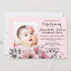 An elegant, pink photo christening invitation you can personalise and send out to your guests for your christening event celebration. All text are set using popular typography. A floral pattern complements the front and back of the invitation on a soft pink background. Enjoy!