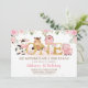 Cute farm themed first birthday invitation for a little girl featuring various farm animals, faux gold word and some lovely pink floral arrangements. This farm 1st birthday invitation is a cute way to set the scene for a farm themed girl's first birthday party.