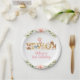 Cute girl's woodland themed second birthday birthday paper plate featuring five cute woodland animals, a faux gold word and some pink floral arrangements.