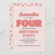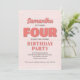Make her day extra special with this girl’s fourth birthday party invitation! Featuring pink "four" typography, a cute floral pattern, and a simple template, this design is perfect for a modern, minimalist celebration. The whimsical calligraphy script adds a playful touch, while the elegant chic flowers bring a stylish whimsy vibe. Personalise this charming invite today for a fun and unforgettable birthday celebration!